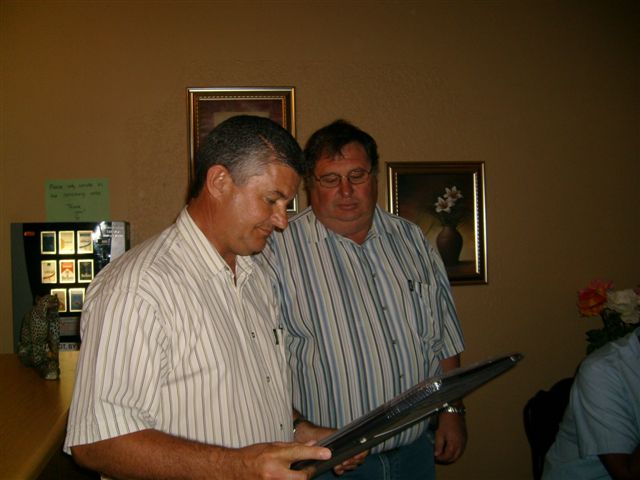 ontvang Sarel Dippenaar (voorsitter) die Herman en Riekie van Wyk-trofee